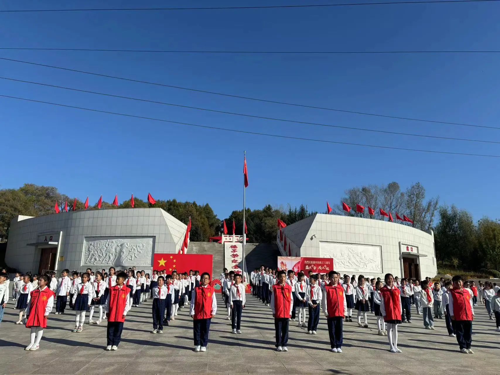五星红旗迎风飘扬,胜利歌声多么响亮……伴随着熟悉的节奏,小小讲解员们、志愿者们、全体职工共同唱响国歌,激昂的旋律,如同一股澎湃的洪流,冲击着每个人的心灵。