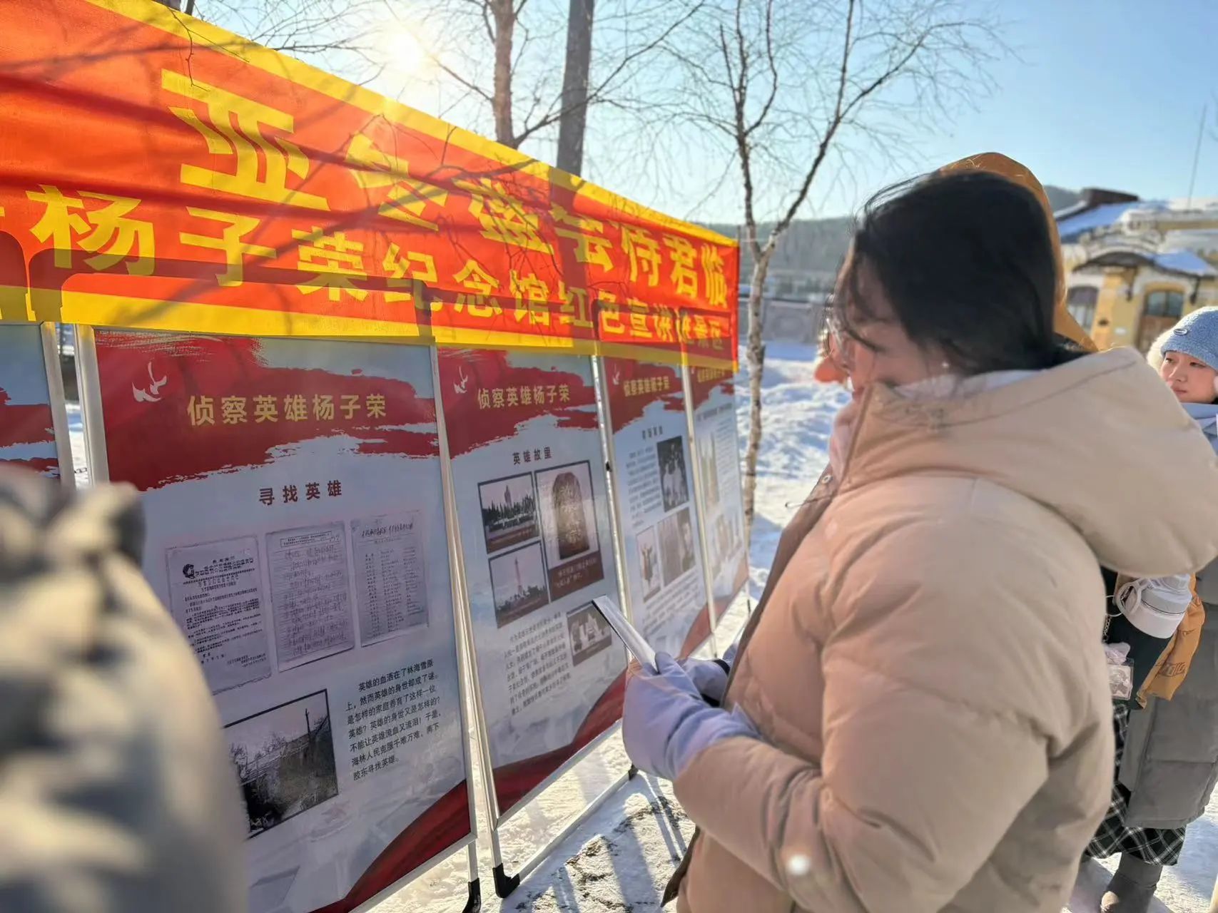 当游客们踏入银装素裹的景区,仿佛步入一个梦幻的冰雪王国。而此时,杨子荣纪念馆的红色宣讲员和志愿者们如同冬日里的暖阳,出现在景区内为游客们分发杨子荣纪念馆宣传册、讲述侦察英雄杨子荣的传奇人生。